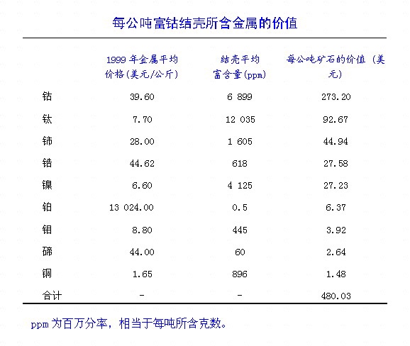 ??? 除钴之外,结壳还是其他许多金属和稀土元素的重要潜在来源,如钛、铈、镍、铂、锰、磷、铊、碲、锆、钨、铋和钼。结壳由水羟锰矿(氧化锰)和水纤铁矿(氧化铁)组成。较厚结壳有一定数量的碳磷灰石,大部分结壳含少量石英和长石。结壳钴含量很高,可高达1.7%;在某些海山的大片面积上,结壳的钴平均含量可高达1%。这些钴的含量比陆基钴矿0.1%至0.2%的含量高得多。在钴之后,结壳中最有价值的矿物依次为钛、铈、镍和锆。