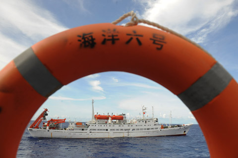 当日,正在太平洋海域执行7000米级载人下潜任务的蛟龙号海试专家组一行9人, 来到 “海洋六号”船上和担任护卫和技术保障任务的的科学家们会师?;崾罂蒲Ъ颐且黄鸩喂哿恕昂Q罅拧贝系南冉瓶忌璞?,并对蛟龙号取得的部分成果进行研讨。