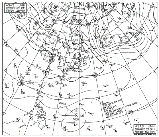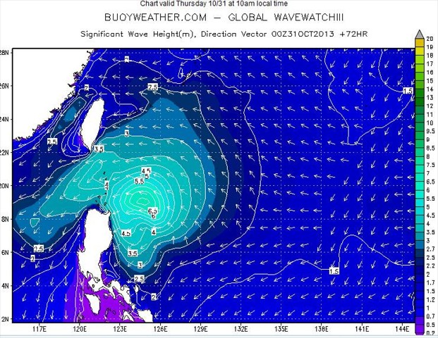 情况很快生变。10月27日,根据最新预报,热带风暴将于10月31日到达巴士海峡,进入南海,比之前的预报快,已经快速移到“海洋六号”前面。同时,随着热带风暴不断加强,大风范围不断扩大,2.5米以上的大浪范围也不断扩大,给航行造成影响。