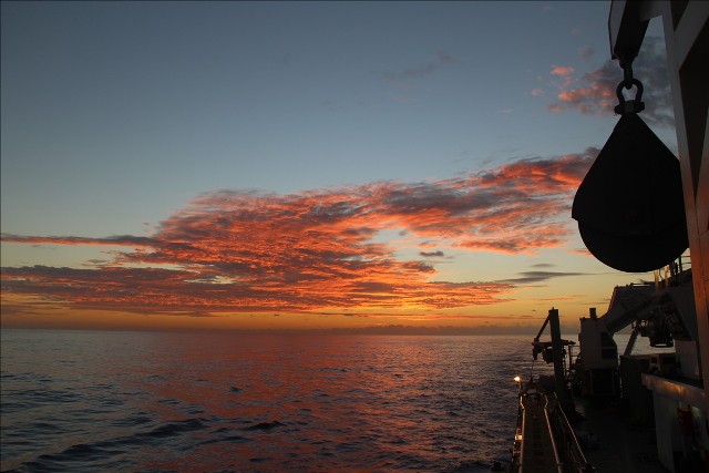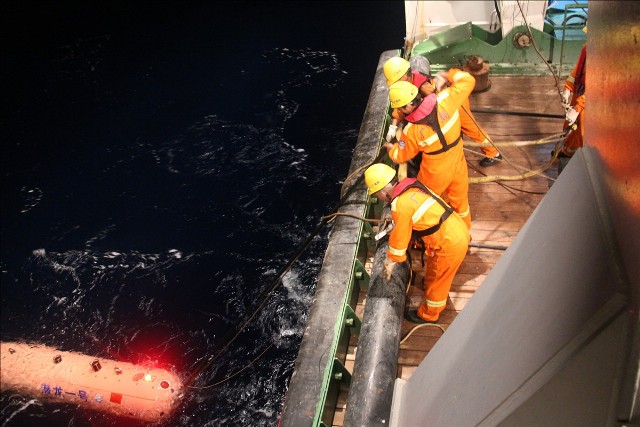 在最后一个航段,主要任务是6000米无人无缆潜器“潜龙一号”的试验性应用工作,与此同时,其他海洋科考任务也很重,要动用浅钻、重力柱、箱式取样器、CTD等各种设备,调查海底富钴结壳和多金属结核资源情况等各种作业。这个航段要有将近一半的时间走航,作业时间相对紧张,AUV作业又占据了一大半作业时间,且多在白天作业,其他作业要保证AUV作业,就只能见缝插针地进行。因此在作业期间,后甲板夜夜灯火通明,从夕阳西沉直亮到朝日东升。