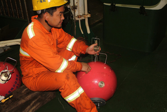应答器锚系的投放非常顺利,夜色中,红色圆球状的长基线应答器上的指示灯一闪一闪,带着4个浮球缓缓沉向海底,在未来的几十天里,它们将一直呆在5000多米的太平洋底,像4盏不灭的路灯,为“潜龙一号”照亮道路。直到潜器完成工作任务,它们才会收到命令,抛掉压铁,浮出海面,重见天日。