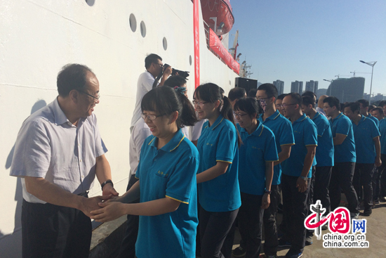 国家海洋局副局长、中国大洋协会理事长王飞为参航人员送船(摄影/中国网 冯竹)