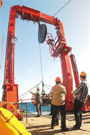 据科考人员介绍,地球是有磁场的,不同性质的岩石磁力存在差异,比如云母石磁力较弱,而含铁、钴、镍的岩石磁力较强;不同的地质构造也会带来磁力变化,比如断层造成几何形态的差异,裂隙或沟壑部位磁力就相对较弱。磁力调查就是根据磁场变化,在热液区寻找异常?! 〈帕Φ鞑榘ê娇?、陆地、海洋和测井等不同形式,而海洋磁力调查又可分为海面调查和近海底磁力调查两种。本次“大洋一号”船采用的是近海底磁力调查,将磁力仪装在深海拖体中,用缆绳下放至离海底150米~200米处,拖曳其慢速前行进行调查。图为调查队员回收海底磁力仪拖体。刘 莉 摄