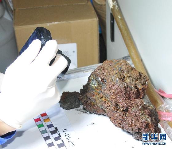 这是“蛟龙”号载人潜水器采集到的硫化物(1月29日摄)。当日,中国载人潜水器“蛟龙”号在西南印度洋执行2014-2015年试验性应用航次(中国大洋35航次)第三航段首次下潜?!膀粤焙旁诹鷶缛纫呵杉蚧锖脱檀蜒?。新华社记者张旭东摄