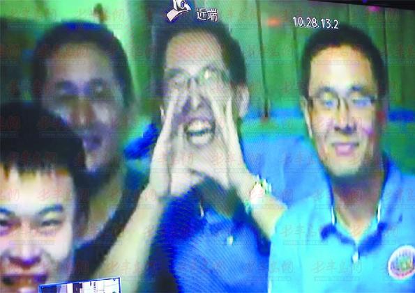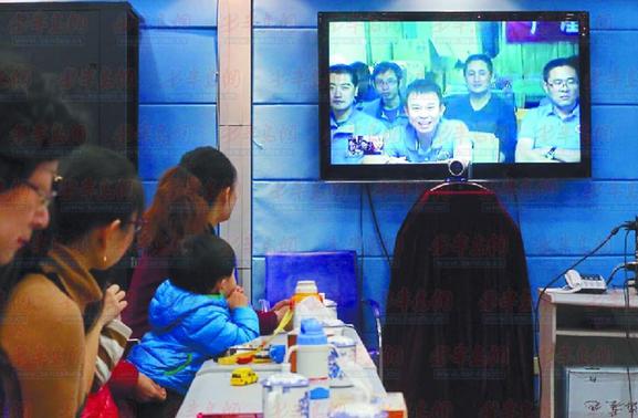 潜航员唐嘉陵及同事们通过可视电话与青岛的家属对话。 本版图/记者 王滨