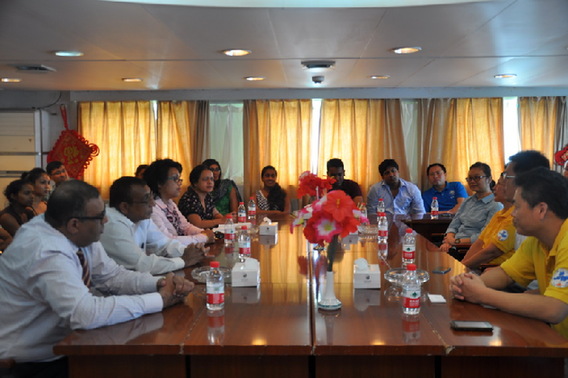 “大洋一号”今天迎来了毛里求斯大学的师生,这是他们首次登上大洋科考船?!按笱笠缓拧笔紫蒲Ъ姨沾夯越樯芰酥泄Q罂瓶既〉玫某删陀虢?。在参观实验室时,研究海洋生物多样性的Louis yohan Didier博士表示,看到“大洋一号”采集的海底生物样品太让人激动了。海洋学院的老师Nadeem Nazwrally曾到青岛参加国际会议,“那时就听说了“海洋一号”,没想到现在见到真实的船,而且就在路易港?!泵锴笏购Q笞试捶岣?,但海洋科研与海洋经济发展刚刚起步,期待与中国开展更多合作。