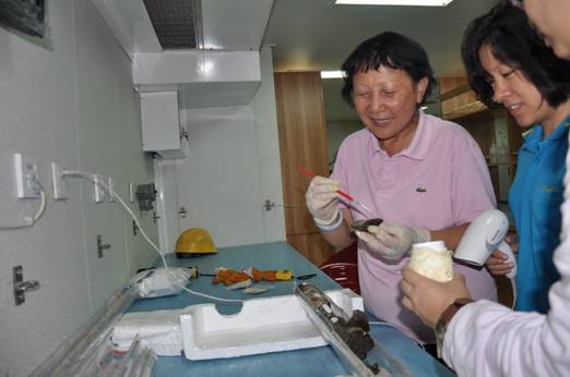 中国地质大学教授苏新(左)正在标记2月20日获取的海底玄武岩标本序号