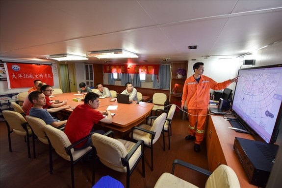 面对严峻的天气,船长蓝明华在临时党委会上及时做了通报,并建议调整航向,往纬度更高的工作区航行,降低台风对船舶航行的影响。首席科学家刘方兰根据目前的天气情况,向中国大洋协会和广州海洋地质调查局请示后,决定暂时放弃原计划的两个工作区,转向500公里外的另一个备用工作区边避风边开展调查。