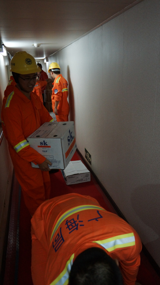 早上9点,第二批补给货品上船。从码头到甲班到厨房冷库,海洋六号全体人员排成一列做搬运接力。东西很沉,但内心的喜悦都挂在脸上。这是本次靠港以来最大也是最后一次进货。(赵凡)