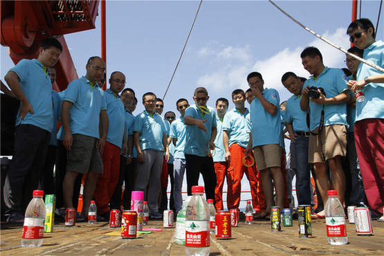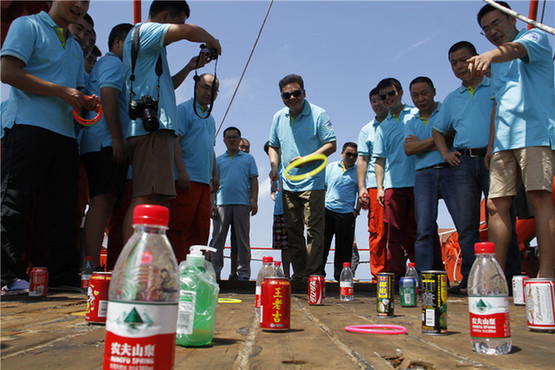 留念结束后,大家纷纷来到后甲板,玩起了套圈游戏。只见首席助理张恺将矿泉水、雪碧、可乐、椰汁、香烟等众多物品摆成一个三角阵,距离三角阵一米开外的位置横栏一条木棍,队员们就站在这木棍后面开始套圈。一人五次机会,有人套走两瓶矿泉水,有人套走一听可乐,也有人套走了最远处的两包香烟……首席科学家陶春辉也兴致勃勃的加入到套圈大军中来,只可惜,什么也没带走,不过首席的加入也让游戏气氛达到了顶峰。