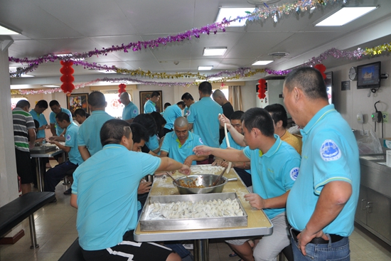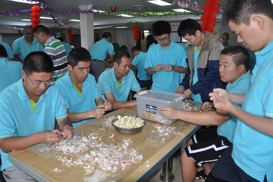 北京时间2月7日下午6点,毛里求斯时间下午2点,全体科考人员与船员汇聚在“向阳红10”船的餐厅,进行了一场欢乐的包饺子活动。掀开桌布,餐桌当面板,每桌人员自由组合,亲自动手揉面、擀皮、包饺子?;岚茸拥牡眯挠κ?,大展才艺,而不会包饺子的包的饺子奇形怪状,令人忍俊不禁……大家在热闹的氛围中顺利的完成了包饺子活动。