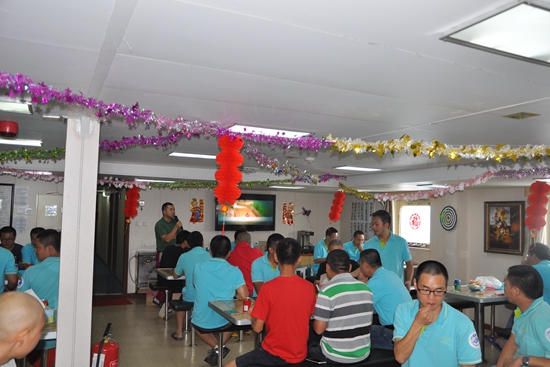?为了与北京时间同步,新年茶话会暨联欢会选择在北京时间下午8点,毛里求斯时间下午4点举行。虽然看不了春晚,但是科考人员和船员纷纷贡献出自己的才艺,打造了一个属于“向阳红10”的独一无二的春晚?!跋蜓艉?0”船卧虎藏龙,人才济济,新年茶话会暨联欢会不仅有歌曲表演,还有掷飞镖比赛,再加上船上组织的抽奖活动,使得气氛热闹非凡。最后,大家共同举杯,与全国人民共同庆祝这个最重要的节日。