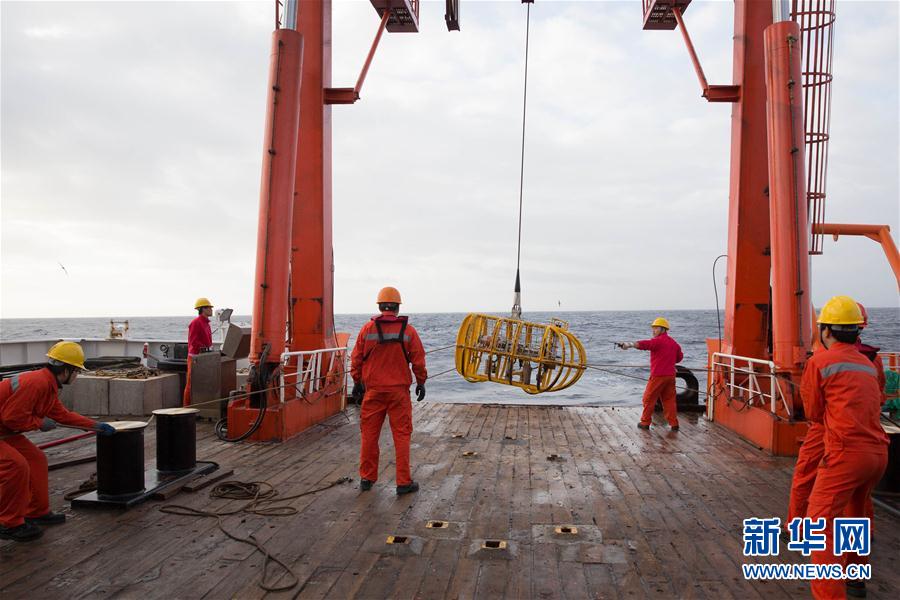 新华社照片,“向阳红10”船,2016年5月15日 用“千里电眼”看海底 5月14日,在“向阳红10”科考船后甲板上,科考队员将光学拖体投放入海。 5月14日,正在西南印度洋执行大洋科考第40航次第四航段科考任务的“向阳红10”科考船开始利用集成化光学拖体考察工作区域。集成化光学拖体是一套基于铠装光电复合缆拖曳作业的高清摄像照相和水体环境探测的集成化拖体,系统主体是由一套高清照相机、一台高清摄像机组成的光学探测系统,同时搭载高度计、浊度计、化学传感器、超短基线等设备。随着科考船慢速前行,科考队员通过拖体可以实时看到上万年未曾有人涉及的几千米深度深海的地质地貌和生物等信息并进行摄影摄像,同时还可以获取深海海域的水体温度、盐度、浊度等各种数据。目前正在“向阳红10”科考船上执行的中国大洋科考第40航次第4航段主要任务是履行西南印度洋多金属硫化物勘探合同,对多金属硫化物进行合同区勘探。该航段将计划完成190公里长度的光学拖体考察。新华社记者金立旺 摄