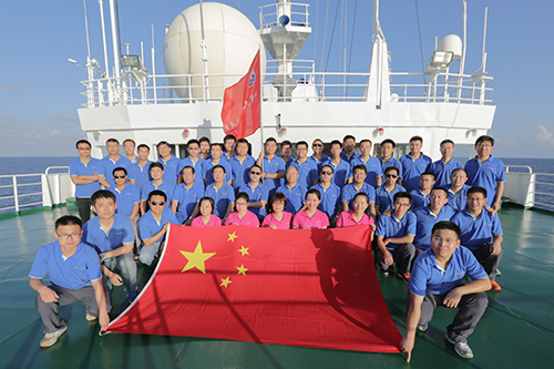 图为“大洋一号”船返航途经赤道时,第五航段全体人员合影,向祖国致意。 汪虹敏/文 杨任屹/图