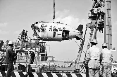图①为2014年11月23日,“蛟龙号”载人深潜器运至江苏省江阴市苏南国际码头与母船“向阳红09”船会师。陈剑摄/光明图片