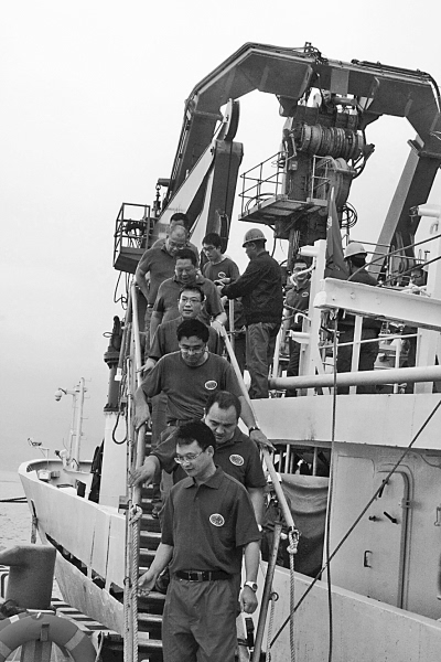 7月13日,青岛国家深?;芈胪?,伴随着嘹亮的汽笛声,国家海洋局“向阳红09”科考船缓缓靠岸,此时,蜚声中外的“蛟龙号”载人潜水器正像一个大胖娃娃静静地躺在“向阳红09”船的怀中。