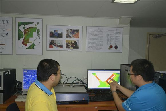 多波束测量进行中,专业助理杨永出现在仪器房,盯着屏幕,脸色严峻?!罢飧龇较蚴芘岳擞跋欤@瞬男矶嗥菰诖锥嗖ㄊ⑸淦鞲浇屏?,波束丢失,大大影响数据质量。”随着他的话,我们看到采集屏幕上实时显示的海底地形上出现了很多破洞,像极了一块烂破布。