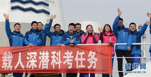 2月6日,科考队员在“向阳红09”船上向岸边送别的亲友和同事挥手告别。当日,“蛟龙”号载人潜水器搭乘母船“向阳红09”起航,执行中国大洋38航次科考任务。在未来4个月中,“蛟龙”号将在西北印度洋开展微地形地貌调查和多金属硫化物、热液流体等样品采集,在雅浦海沟和马里亚纳海沟开展深渊科考。新华社记者张旭东 摄