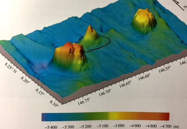 位于北纬8度12.62分、西经146度38.70分的苏轼海丘,以及苏洵圆海丘、苏辙圆海丘地形图(上)及三维图(下)。