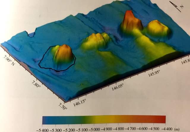 位于北纬7度49.67分、西经146度6.42分的王勃圆海丘,以及“杨炯海丘”“卢照邻圆海丘”“骆宾王圆海丘”地形图(上)及三维图(下)。