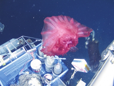 那是一只通体红色、类似乌贼的深海生物,舞动着头部的蹼状腕足和尾部的圆鳍,似乎在与“蛟龙”友好地嬉戏。坐在左舷的赵晟娅赶紧拍摄了一段视频,将神秘生物记录下来?!八坪跸不豆?,对潜水器的照明设备很感兴趣?!闭躁涉晃粗锏拿览鑫恢庇镁低范宰妓?。这只神秘生物扭动着柔软的腰肢,像一只飘逸的水母,也仿佛盛开在海底的鲜花。