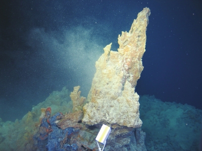 经过近3小时的航行,第一座硫化物烟囱进入了潜航员的视野,这座静静矗立的褐色山丘,看上去已经停止活动很久了。唐嘉陵说,经实地调查,卧蚕2号热液区并没有发现正在活动的热液口,只有一处低温热液流正在溢出,热液活动已经接近末期。