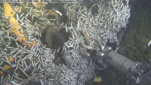 参加此次考察的国家海洋局第二海洋研究所副研究员王叶剑表示,相比卧蚕1号热液区,t的热液喷口较少、活动性较弱,看到的黑烟不多,但烟囱体体量庞大,同时存在规模较大的硫化物堆积体,高度可达30米,为烟囱倒塌后堆积而成。此次下潜还观察到了数量惊人的盲虾群。密密麻麻的盲虾层层覆盖在烟囱体上,仿佛争相畅饮热液喷口中流出的“琼浆玉液”。潜航员操作机械手,用可关闭式抓网捕捉到7只盲虾样品。