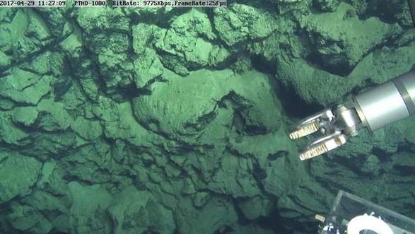 随后,张奕再一次操作着蛟龙号向海山靠近,机械手缓缓伸出,像一只水母伸出的长长触手,一把抓住一块凸起的岩石,麻利地放进取样篮。