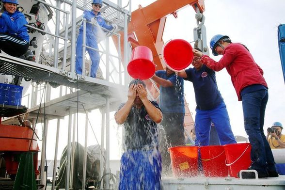 石学法爬出载人舱,走下铁架。一桶桶海水从头而降,他张开臂膀,迎接浇灌?!跋春T琛笔窃厝松钋倍允状蜗虑比嗽钡亩捞鼗队鞘?。