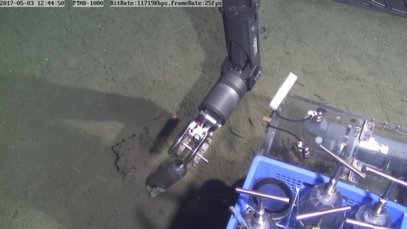 8时42分,蛟龙号抵达预定深度后,首先沿东沙东南部高速堆积区一条测线开展了1.8公里高精度测深侧扫微地形调查。随后,蛟龙号进行近底观察和取样,完成了环境参数测量,采集了近底海水、沉积物和生物等样品,拍摄了大量海底高清视频照片资料。