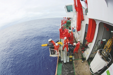 当地时间9月2日13时30分,东太平洋海域大雨滂沱,经过近1个小时的努力,科考队员成功将1台水下滑翔机回收至“向阳红03”船右舷甲板。至此,中国大洋45航次科考队在该海域布放的3台水下滑翔机全部回收,标志着我国首次利用水下滑翔机在东太平洋多金属结核区开展的立体组网观测试验圆满成功。