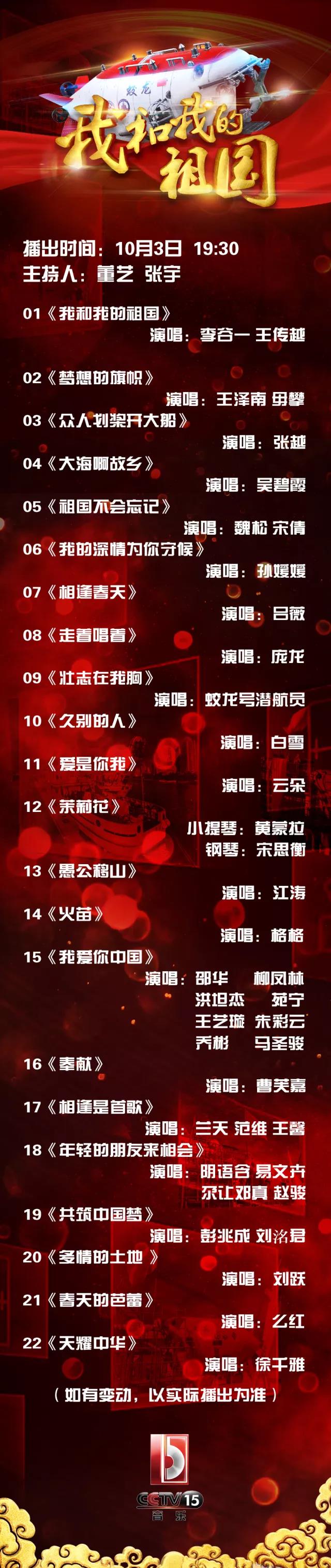 “我和我的祖国一刻也不能分割,无论我走到哪里都流出一首赞歌……”在这双节同庆、举国欢腾的盛大节日中,CCTV15音乐频道国庆特别节目将连续五天,与您相约走近神州大地上正在建设的超级工程,带您感受大国的力量,感受腾飞的中国!