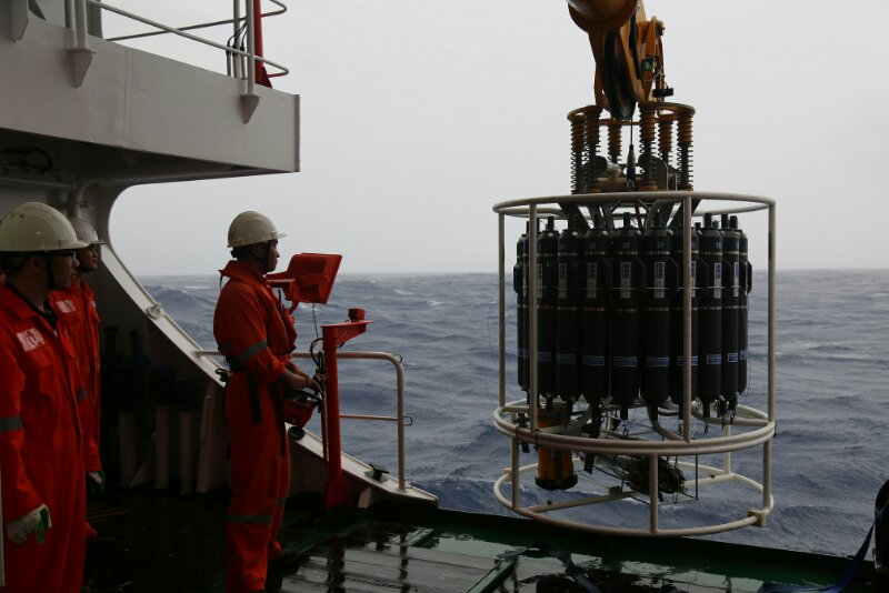 日前,记者从中国大洋矿产资源研究开发协会了解到,当地时间10月18日8时许(北京时间10月19日2时),正在中东太平洋执行大洋45航次科考任务的“向阳红03”船,顺利抵达北纬10°断面作业区。随后,科考队在首个站位冒雨进行了CTD(温盐深仪)采水作业。