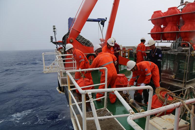 一切准备就绪。几名科考队员先将连接在设备上的3个浮球陆续投入海中。突然,一场大雨毫无遮拦地从天而降,队员们只能冒雨在后甲板开展作业。