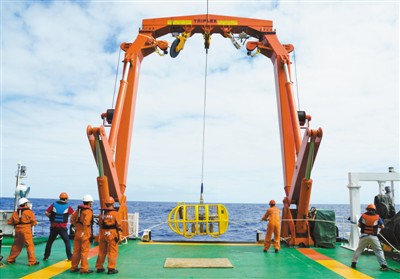 正在执行中国首次环球海洋综合科考暨中国大洋46航次的“向阳红01”船,于西一区时间11月28日上午抵达南大西洋作业海区,开始第三航段科考作业。图为28日科考队员正在布放深海光学拖体。