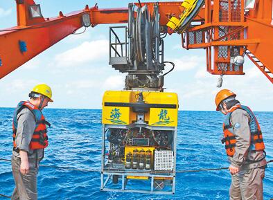 3月24日,中国“大洋一号”科考船上搭载的重点装备“海龙Ⅲ”潜水器在西太平洋圆满完成400米浅水试验,这是“海龙Ⅲ”潜水器首次海试?!昂A蟆笔粲谥泄膀粤胶!惫こ讨氐阕氨?,最大作业水深6000米,具备海底自主巡线能力和重型设备作业能力,可搭载多种调查设备和重型取样工具。图为“海龙Ⅲ”潜水器准备入水进行试验。