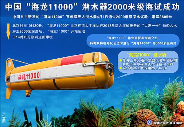 中国自主研发的“海龙11000”万米级无人潜水器1日通过2000米级深水试验,潜深2605米。