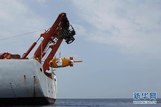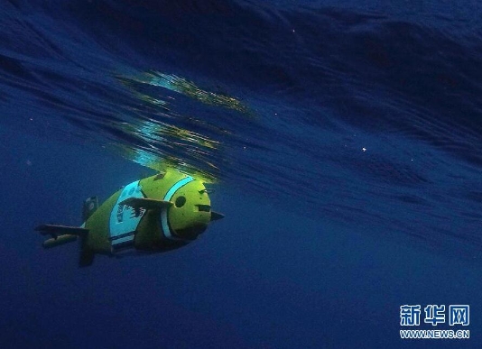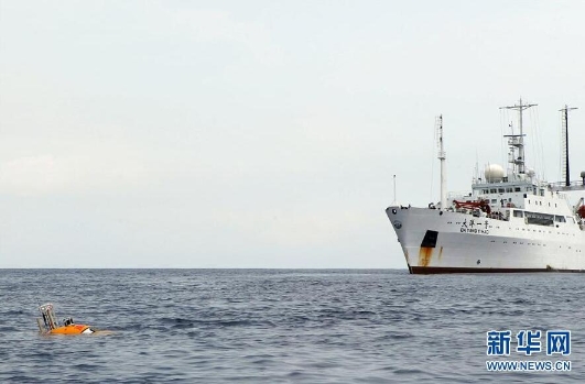 “潜龙三号”从海底回到水面(4月25日摄)。 新华社记者刘诗平摄