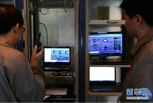 科考队员在母船上监控“潜龙三号”上浮工作状态(4月25日摄)。新华社记者刘诗平摄