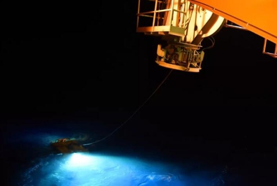 北京时间4月4日18时30分,“海龙Ⅲ”从正在执行2018年综合海试任务的“大洋一号”科考船入水,加挂浮球后开始下潜。