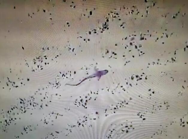 有没有在红笔标识的地方隐约看见一条细长的生物。海蛇?NO,海蛇一般在热带或亚热带的海域上层活动。这是海鞭,它们和海笔一样属于腔肠动物。