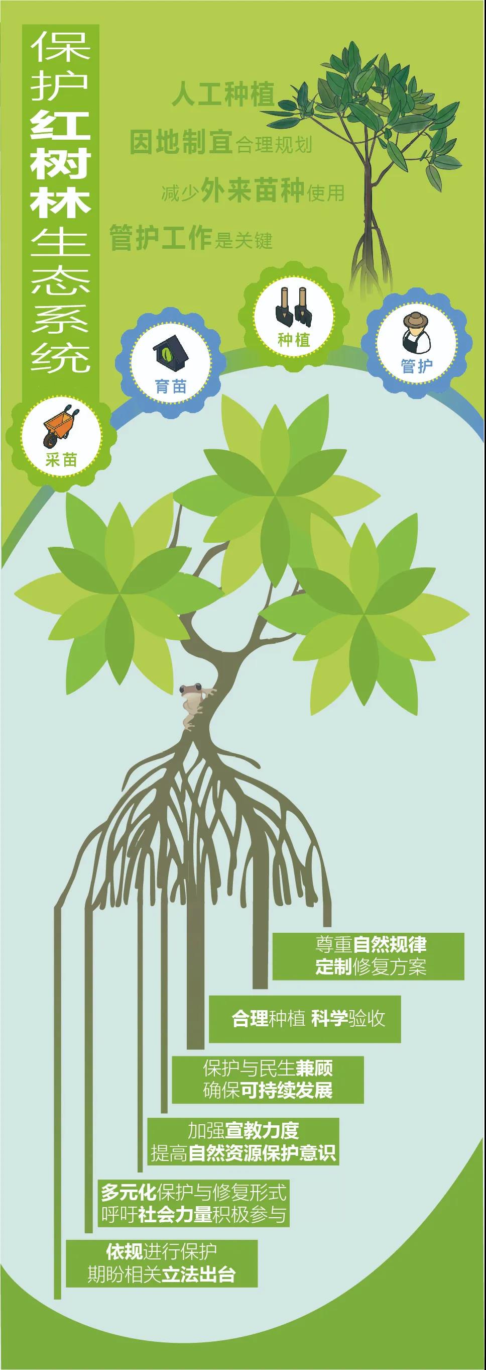 目前,我国已经遏制住了红树林被破坏的趋势,红树林的面积在稳步增长。这与我国社会各界开展的宣传、?;ず托薷垂ぷ魇欠植豢?。近年来,我国设立了多个红树林自然?;で秃焓髁质毓埃行У乇;ち撕焓髁稚低?;积极进行红树林的人工种植,增加了红树林的面积;社会各界也不断加强自然宣教力度,提高公民自然资源?;ひ馐?。