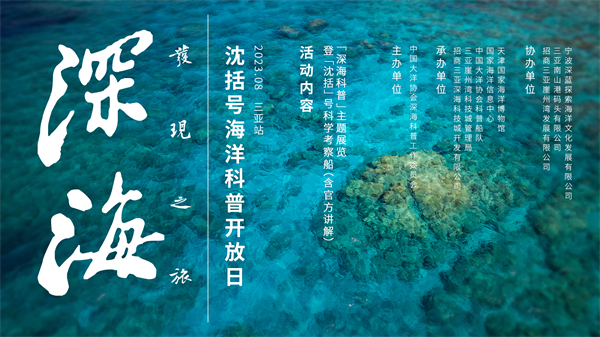 本次开放日由中国大洋协会指导,中国大洋协会深??破展ぷ魑被嶂靼?,国家海洋博物馆、国家海洋信息中心、中国大洋协会科普船队、三亚崖州湾科技城管理局、招商三亚深??萍汲强⒂邢薰境邪?,宁波深蓝探索海洋文化发展有限公司、三亚南山港码头有限公司、招商三亚崖州湾发展有限公司协办。